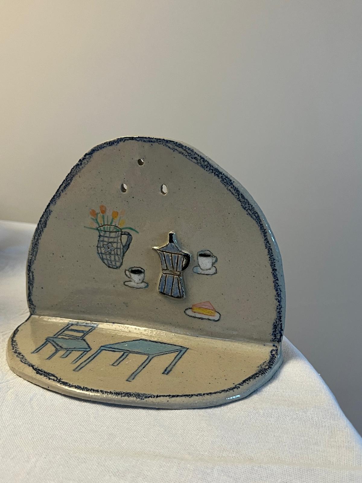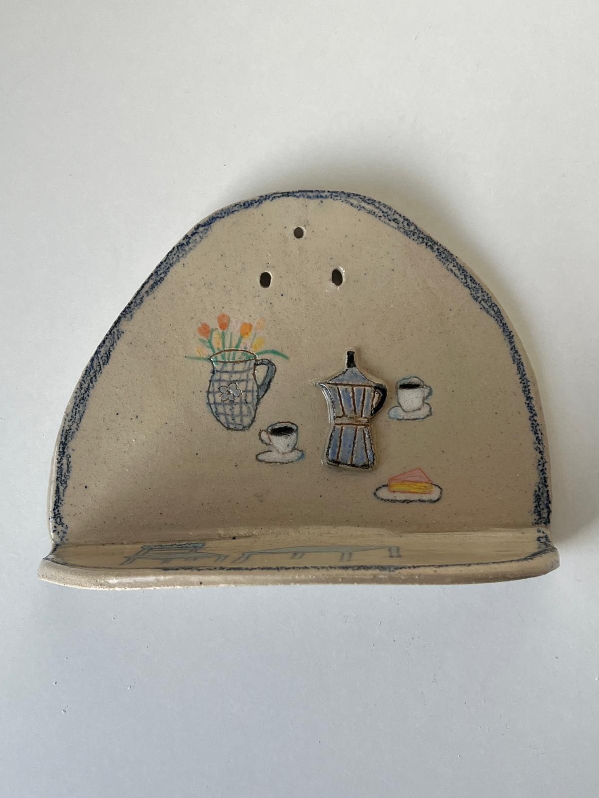Hand built and glazed in a soft, speckled cream, with hand carved and hand painted details of 3D moka coffee pot, cups, flowers and a slice of cake—simple things that make a space feel lived in.