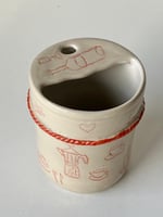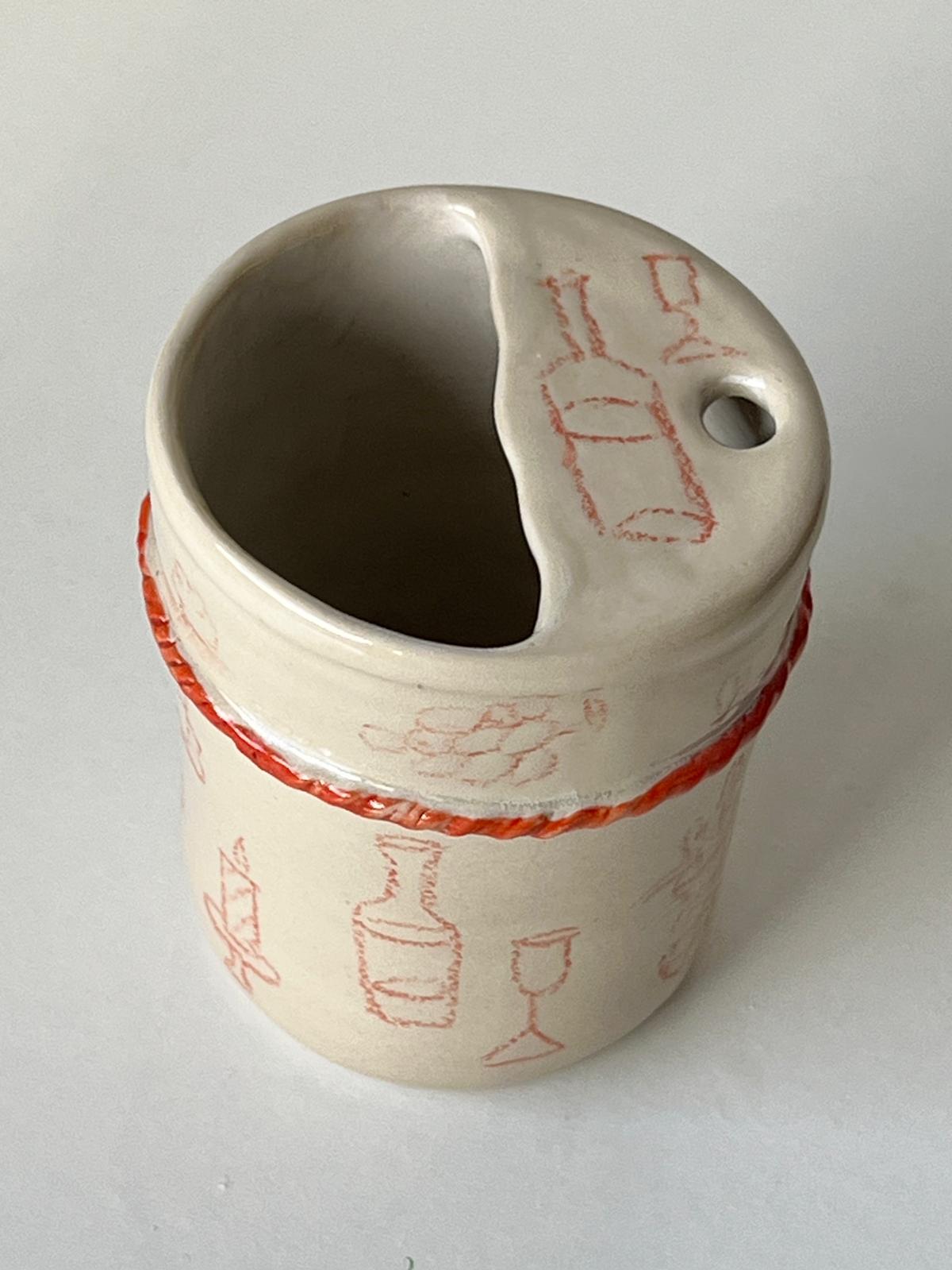 A red clay rope is attached around the body by hand. Simple red drawings are painted freely on the surface. Each line is slightly different.