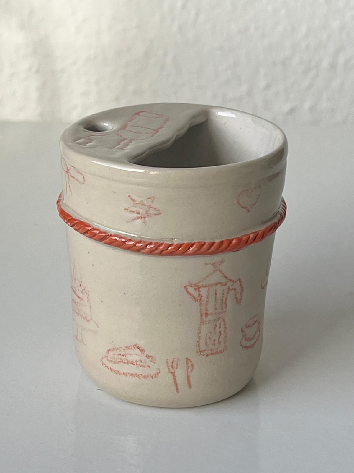 A wheel thrown ceramic coffee to-go tumbler with a built-in drinking lid.